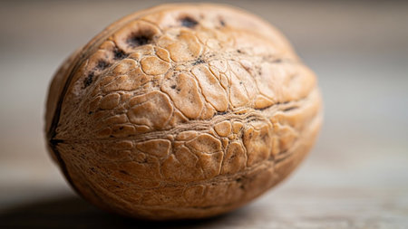 Extreme close-up of a single whole walnut showcasing its deeply textured brown shell with dark crevices on a blurred wooden surface.