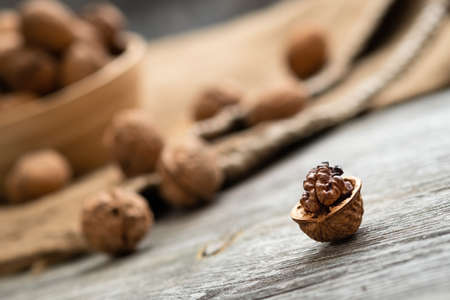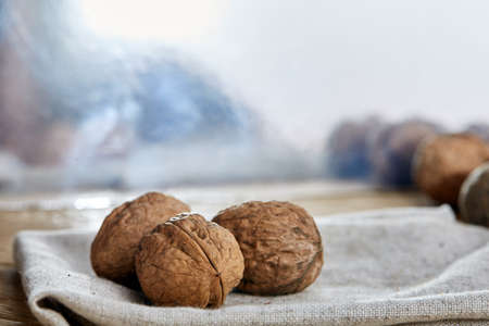 A stack of hard shells of walnuts piled together on light grey fabric cotton napkin and isolated on rustic wooden background, copy space, shallow depth of field, selective focus, front focus, macro. Nutritious food. Healthy lifestyle concept.