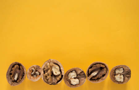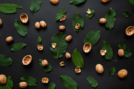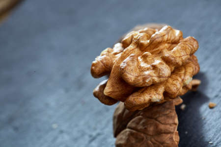Top view close-up picture of nutritious tasty dry cracked walnuts on dark background, shallow depth of field, selective focus, macro. Seasonal nuts. Oilrich food. Healthy lifestyle concept.