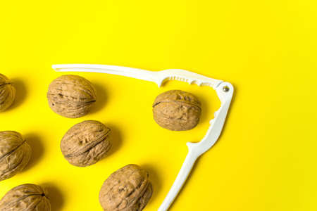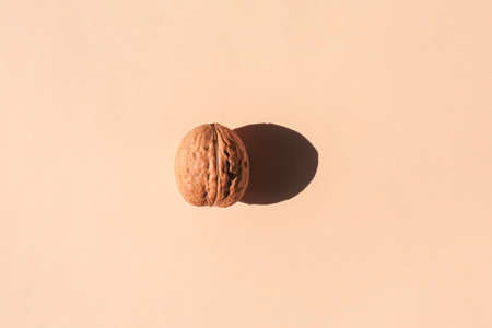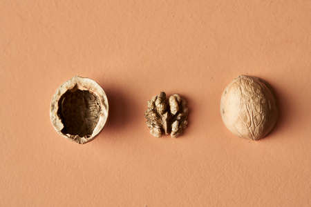 Walnut shell and walnut isolated on beige background, conceptual photography for food blog or advertising