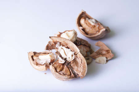 Close-up of walnut in wooden shell and kernels isolated on light copy space background. Healthy organic food concept.