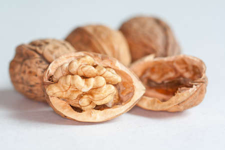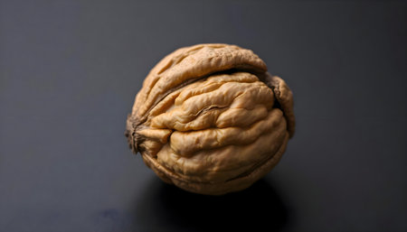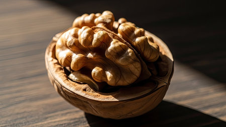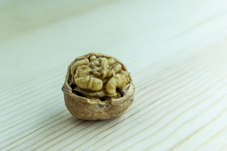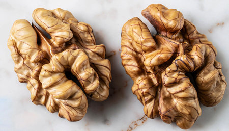Close-up of open walnut on light surface, resembling brain, with blurred background