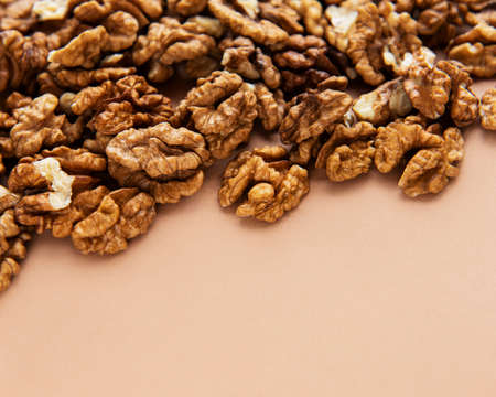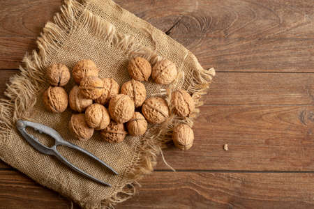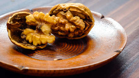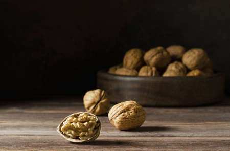 Walnuts on a dark brown wooden background. Nuts are a source of vitamins and vegetable protein. Copy space