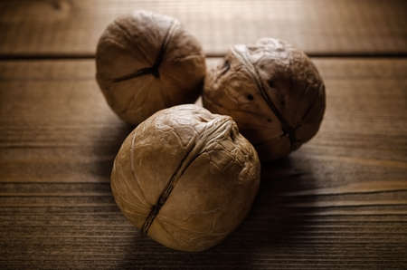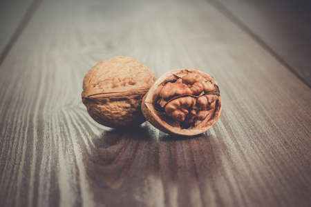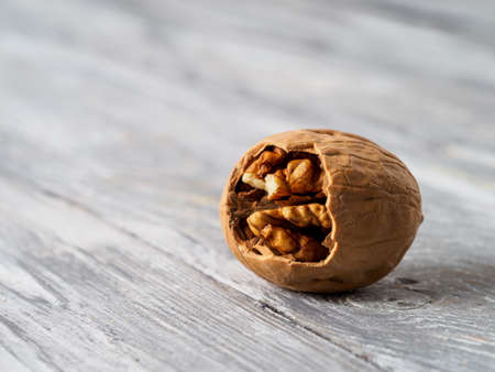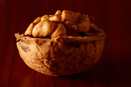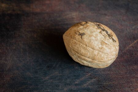 Walnut on a dark wooden background. Walnut with dried webbed membranes. Lone nut on a shabby background