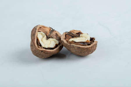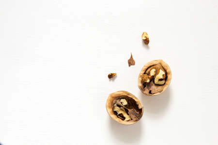 Two halves of a walnut on a white background. Horizontal orientation, top view, with copy space.