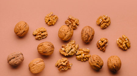 Walnuts in shell and peeled are lying on a brown background, creating a beautiful still life