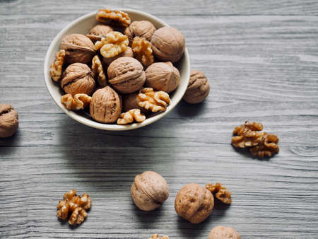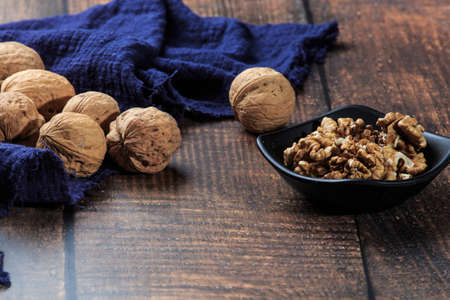 Fresh walnut kernels and whole walnuts in a bowl on rustic old wooden table. Healthy organic food, BIO viands, natural background. Copy space for your advertising text message.