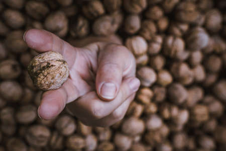 Walnuts in woman hand, Hunan holding kernels of walnuts