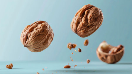 Walnut halves and fragments are artistically suspended against a soft blue backdrop, highlighting their intricate textures and natural appeal in a visually engaging manner, AI generated