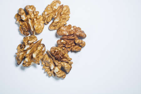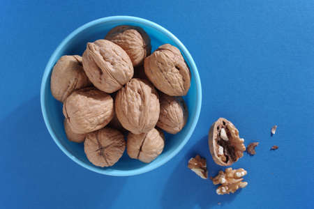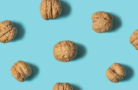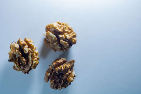 Top view of walnut kernels isolated on blue background. Minimal concept