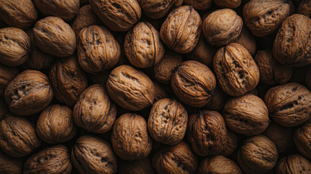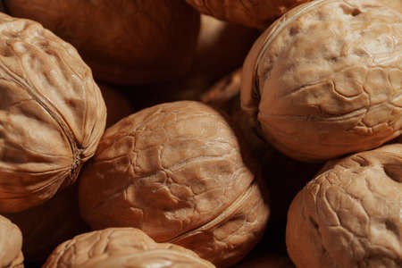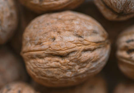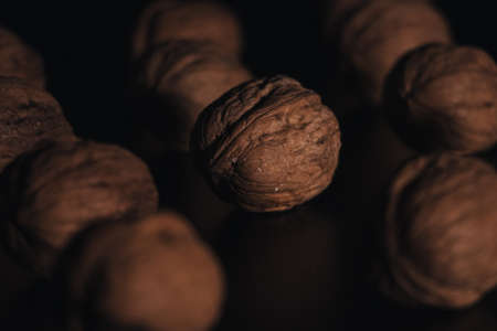 Walnuts in close up. Walnuts in shells lying on dark table.