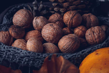 Close up of nuts. Dark food. Concept of slow and healthy food. Autumn-winter seasonal meal