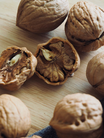 A closeup selective focus shot of delicious fresh walnuts on a wooden surface