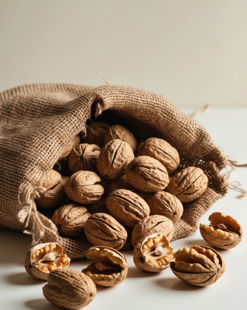 AI Generated. Walnuts in their shells nestled in a burlap sack