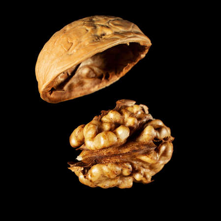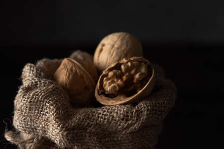 walnuts on a black background, you can see a cracked walnut, selective focus.