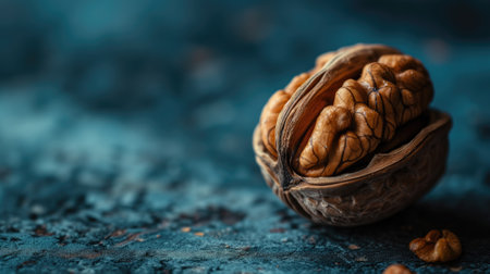 Walnut kernel on blue slate surface. Healthy nuts and seeds composition.