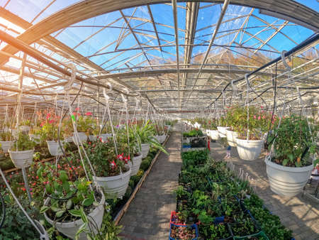 Greenhouse or glasshouse with many flower potted plants, also flower pots hanging from the ceiling