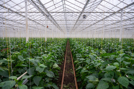 Big ripe sweet bell peppers, green paprika plants growing in glass greenhouse, bio farming in the Netherlands