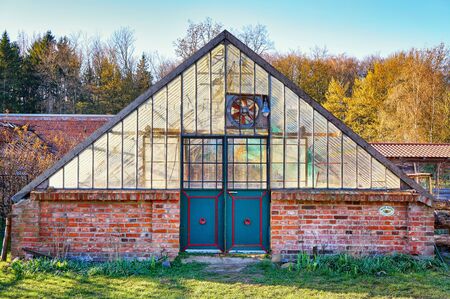Old greenhouse with brick wall and glass panes. The entrance is an antique old door.