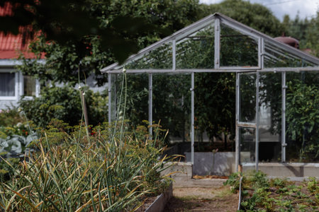 Greenhouse building for sustainability, earth and eco friendly plant growth methods for a garden. Sustainable, ecology and green environmental construction in nature with trees, grass and ground