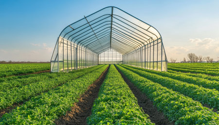 Lush green crops grow abundantly inside a large greenhouse, basking in bright daylight.
