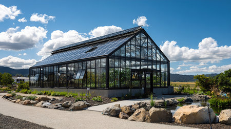 Modern greenhouse surrounded by lush fields a harmonious blend of nature and innovation