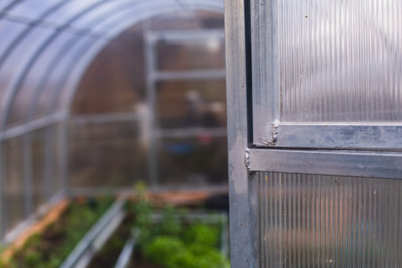 Beautiful view of a greenhouse in the sun. Sunlight through the glass.