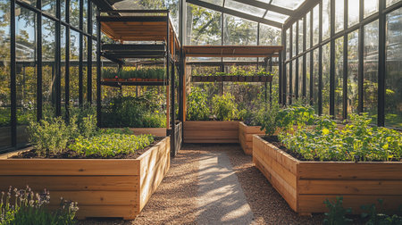 A serene greenhouse filled with lush greenery and vibrant flowers