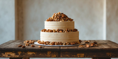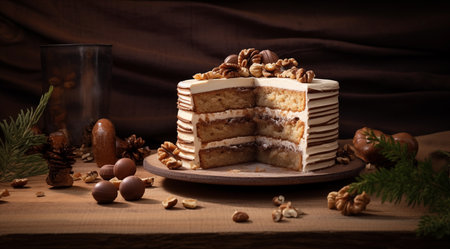AI Generated. Decadent layered cake on rustic wooden table with nuts