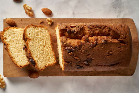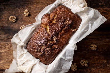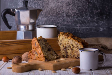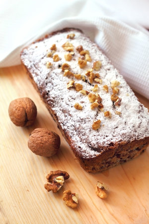 The banana cake with walnuts and maple syrup cut with slices on a wooden table