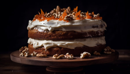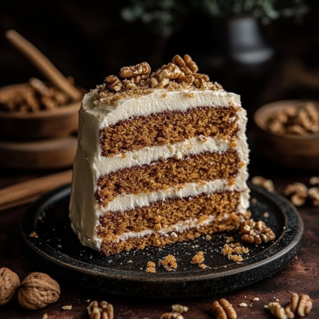Indulgent Slice of Moist Carrot Cake with Cream Cheese Frosting and Crunchy Walnut Topping on Plate
