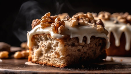 Delicious slice of spiced cake topped with cream and nuts on a rustic wooden table in a cozy setting