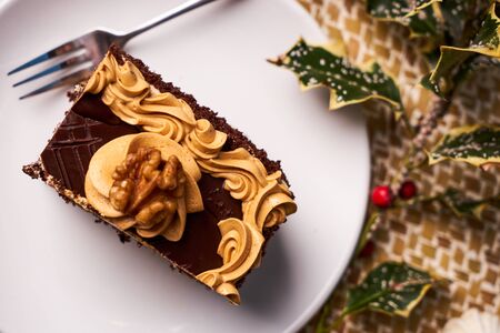 Piece of Chocolate cake with walnut and whipped custard sour cream on cake board with decorations, close-up. Sweet dessert food