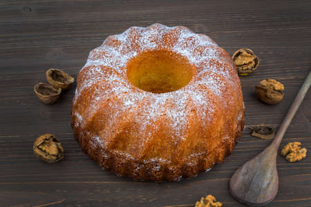 Homemade pumpkin cake with walnuts on rustic wooden background.