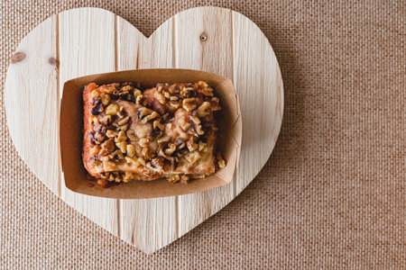 Walnut cinnamon roll close up on a wooden heart-shaped board, flat lay with copy space