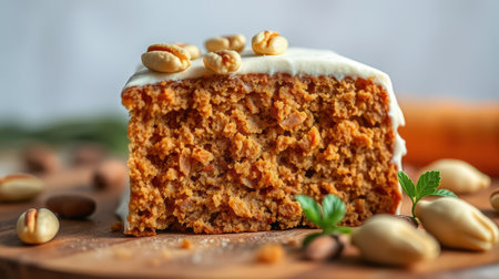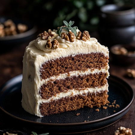 Moist carrot cake slice with creamy frosting and crunchy walnuts, a perfect dessert treat.