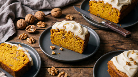 A beautifully arranged loaf cake with creamy frosting and nut garnish, exuding warmth and perfect for festive gatherings or cozy moments. Ideal for dessert lovers.
