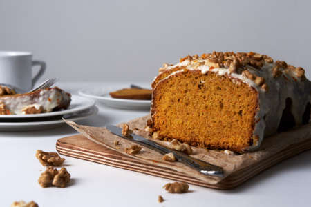 Delicious homemade carrot cake with nuts for snack on wooden table. Food concept.