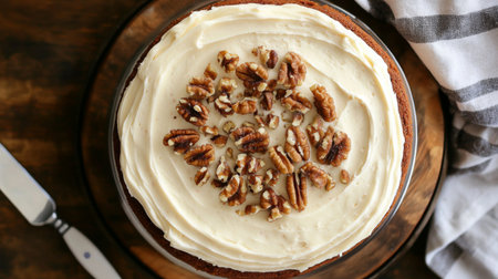 Detailed shot from above of a classic carrot cake with cream cheese frosting and a sprinkle of walnuts, capturing its rustic charm and homemade appeal.