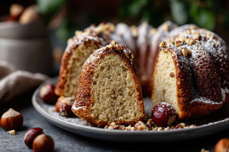 Close-up of a sliced hazelnut cake reveals its moist texture and crunchy chopped nuts inside. The cake is garnished with powdered sugar and whole hazelnuts.