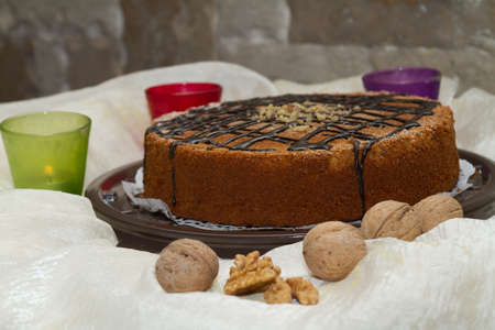 Delicious homemade cake with meringue, walnuts on a light background. Concept of natural homemade baking.
