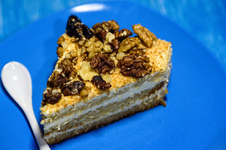 Walnut sponge cake slice photographed close-up on a blue plate, on wooden background.