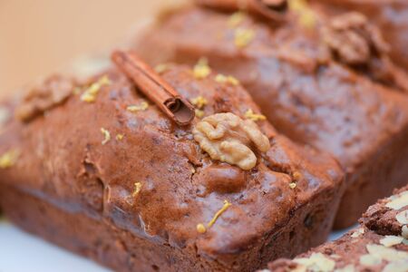 Cacao sponge cake with nuts and cinnamon for candy bar closeup