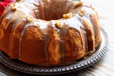 Delicious, Pumpkin Spice Bundt Cake frosted with brown sugar glaze and walnuts oven a rustic wood table background.