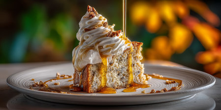 Decadent Maple-Bourbon Cake Slice with Whipped Cream, Caramel Drizzle, and Autumnal Background