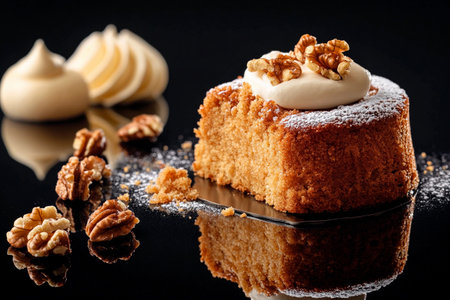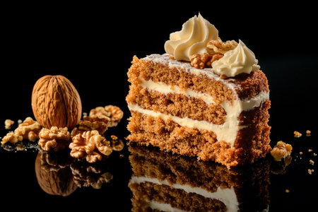 A decadent slice of cake topped with cream and walnuts sits on a shiny black surface. Surrounding it are scattered walnuts and a decorative swirl of cream, creating an inviting dessert display.