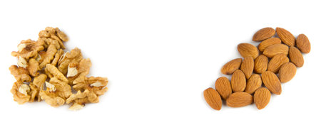 Almond and walnut isolated on white background. Wide photo. Free space for text.