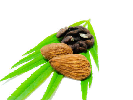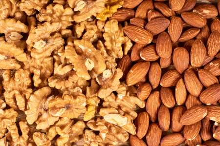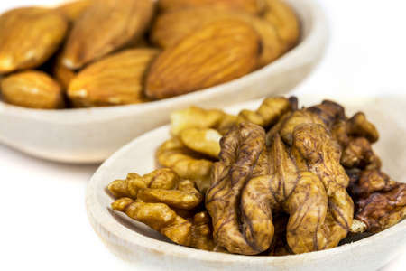 Walnuts and almonds in a white background