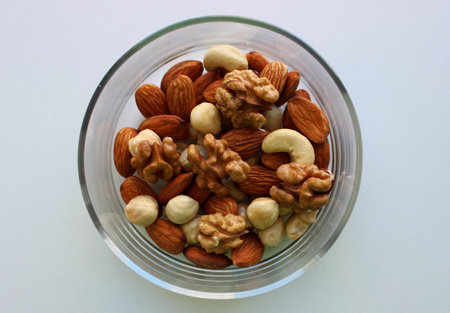 Assorted mixed nuts on a light gray textured background