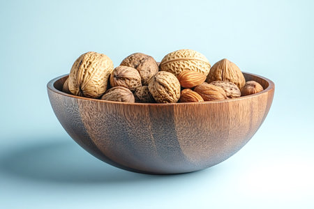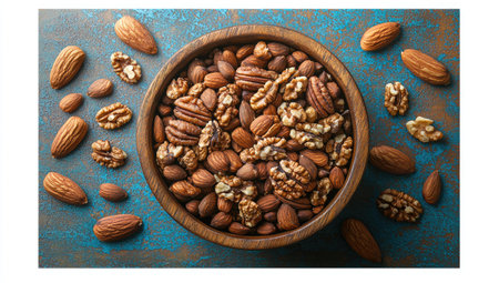 Beautiful wooden bowl is overflowing with a variety of nuts, including walnuts, almonds, and other varieties, creating a visually appealing arrangement set against a vibrant blue backdrop